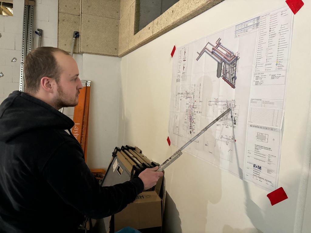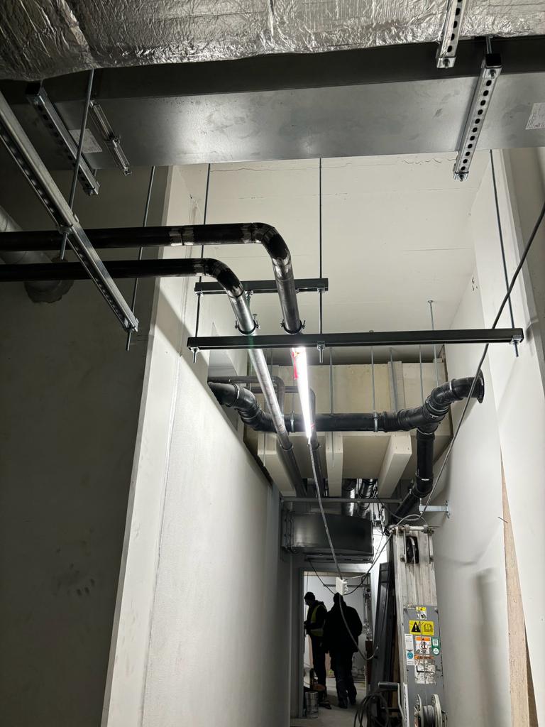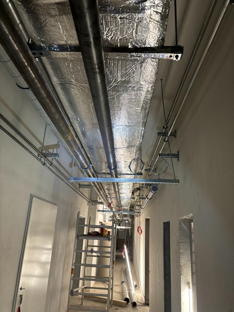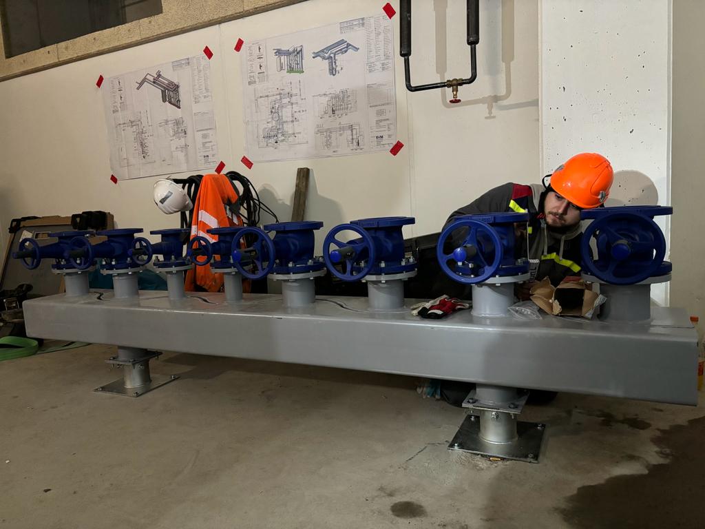 Materiál (potrubí DN 15-150 z nízkolegované oceli) byl na stavbu vozen v různých intervalech zpracováván postupně. Naši pracovníci svařovali metodou 141 (TIG) a instalovali potrubí na kovové závěsy se závitovými tyčemi.